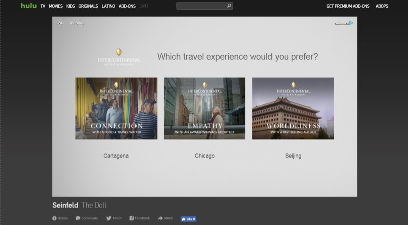 How do you make brand videos about connection, empathy, and worldliness resonate? I added a question headline, destinations, and descriptions of our protagonists to help invite Hulu viewers to choose their favorite.